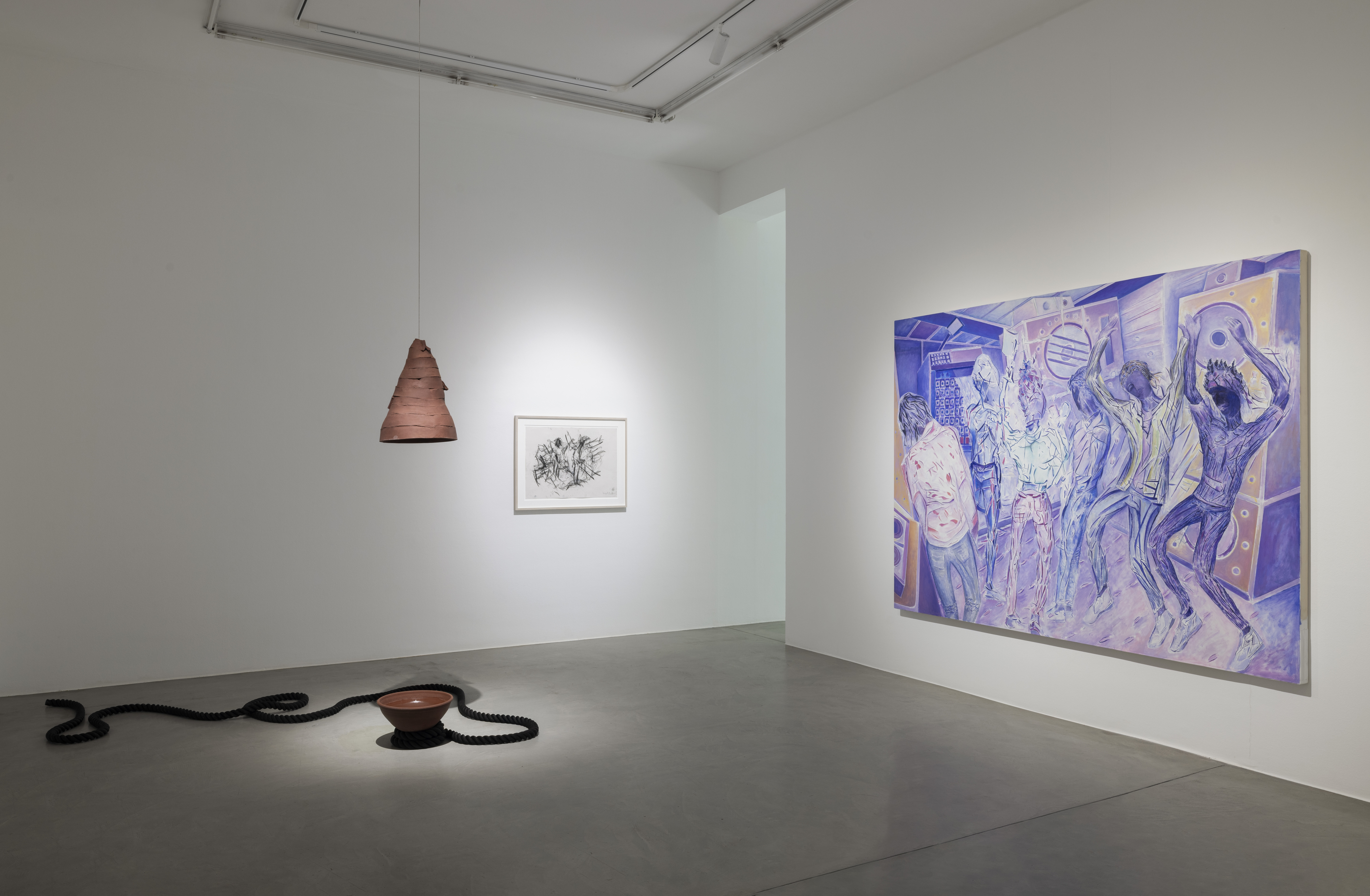 Starting from the structure of dub music, which speaks of rupture and repair, something that leaves and returns, the exhibition observes through the works on paper and paintings of Denzil Forrester and Kate Spencer Stewart and the sculptures of Phoebe Collings-James, repeated visual gestures, felt and revised under new visual forms. The artists have in common strong connections with music, not only dub, but also genres that emerged from this style. They also share a process of reinterpretation of art historical and socio-political traditions, which still shape contemporary art and help us understand our positions as subjects in continuous formation. As sociologist Stuart Hall affirms, it is by ‘detouring’ through pasts that we can produce ourselves anew as subjects. “It is therefore not a question of what our traditions make of us, so much as what we make of our traditions. […] Culture is not a matter of ontology, of being, but of becoming”.