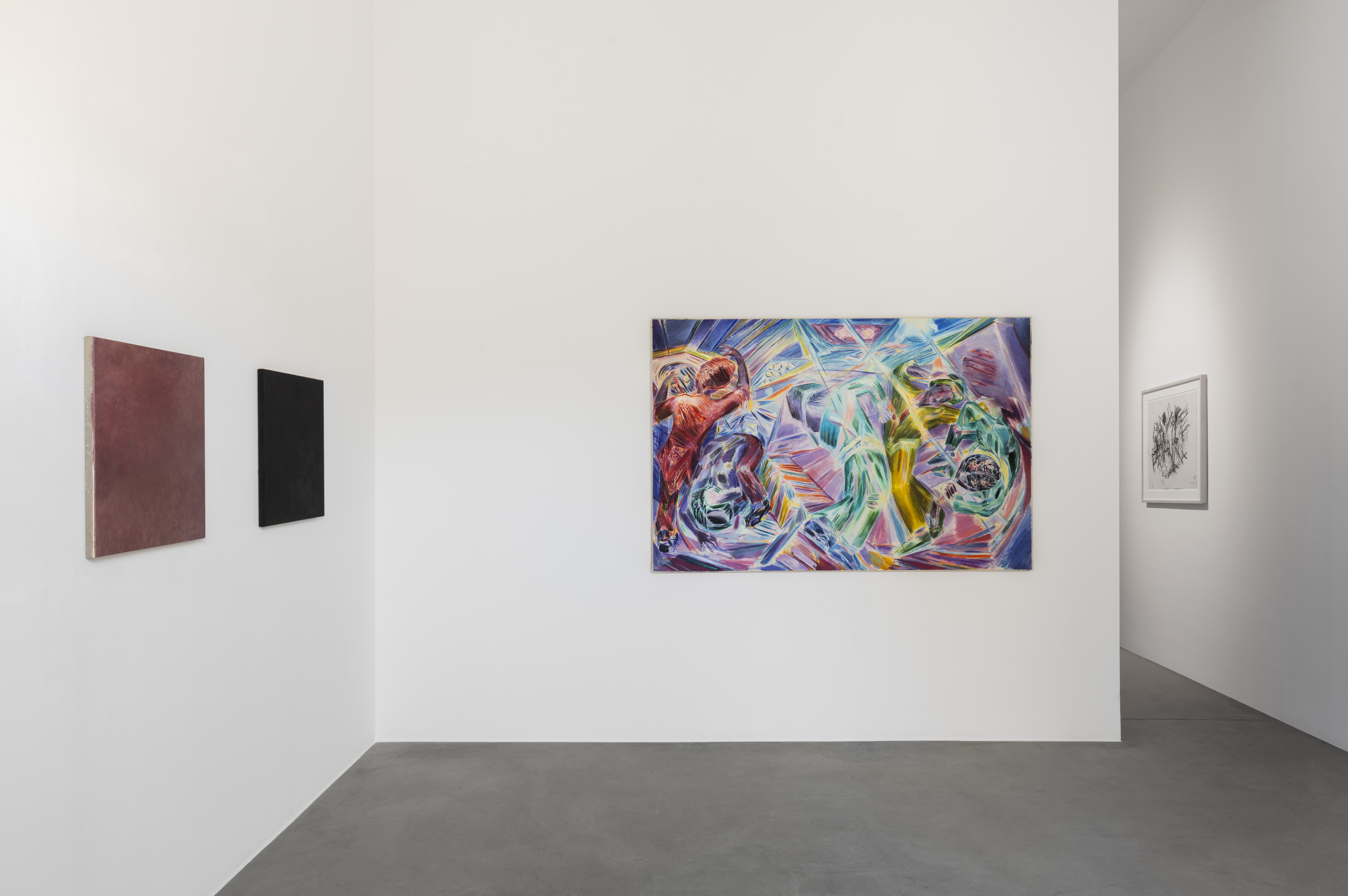 Kate Spencer Stewart’s (b. 1984, Phoenix, AZ, US; lives in Los Angeles, US) minimal paintings depict everything and nothing. It is almost impossible to see them in photographs. We must walk around them, lower our eyes or move them in various ways to discover the details. The surface transforms with light and movement, creating voids, flashes, optical mixes, and moments of suspense. If observed long enough, the colours become intoxicating and hallucinatory; their shadow imprints on the retina like white noise in space, setting in motion a process of transcendence similar to that caused by ambient music and drone. Stewart grew up playing different instruments including the organ, piano, sax, accordion, and bass. Before exhibiting in galleries, her paintings were presented in music venues. Stewart’s process involves layering brush strokes and repetitive marks over underpainting, often in contrast to the final layer. The works echo the minimalist tradition of ‘color field’, particularly Ad Reinhardt’s signature black paintings, where colour became a subject in and of itself. Stewart’s paintings become visualisations rather than representations; they are not only objects to look at, but to look with. Gazing intently at the paintings may reveal a multitude of stories. Frag (2025) recalls the hedonistic influences of Fragonard’s Rococo; Troche (2025), a pictorial study of the pigment Rose Madder, derived from madder roots and highly sensitive to light, conjures Egyptian tombs, the ruins of Pompeii, and J.M.W. Turner’s eerie landscapes. Other ‘black studies’ evoke voids and theatrical backdrops. As the artist asks: ‘Why can’t we see the world as pure matter, pure form, pure gesture? […] Is it language that holds us back?’ — Giulia Civardi