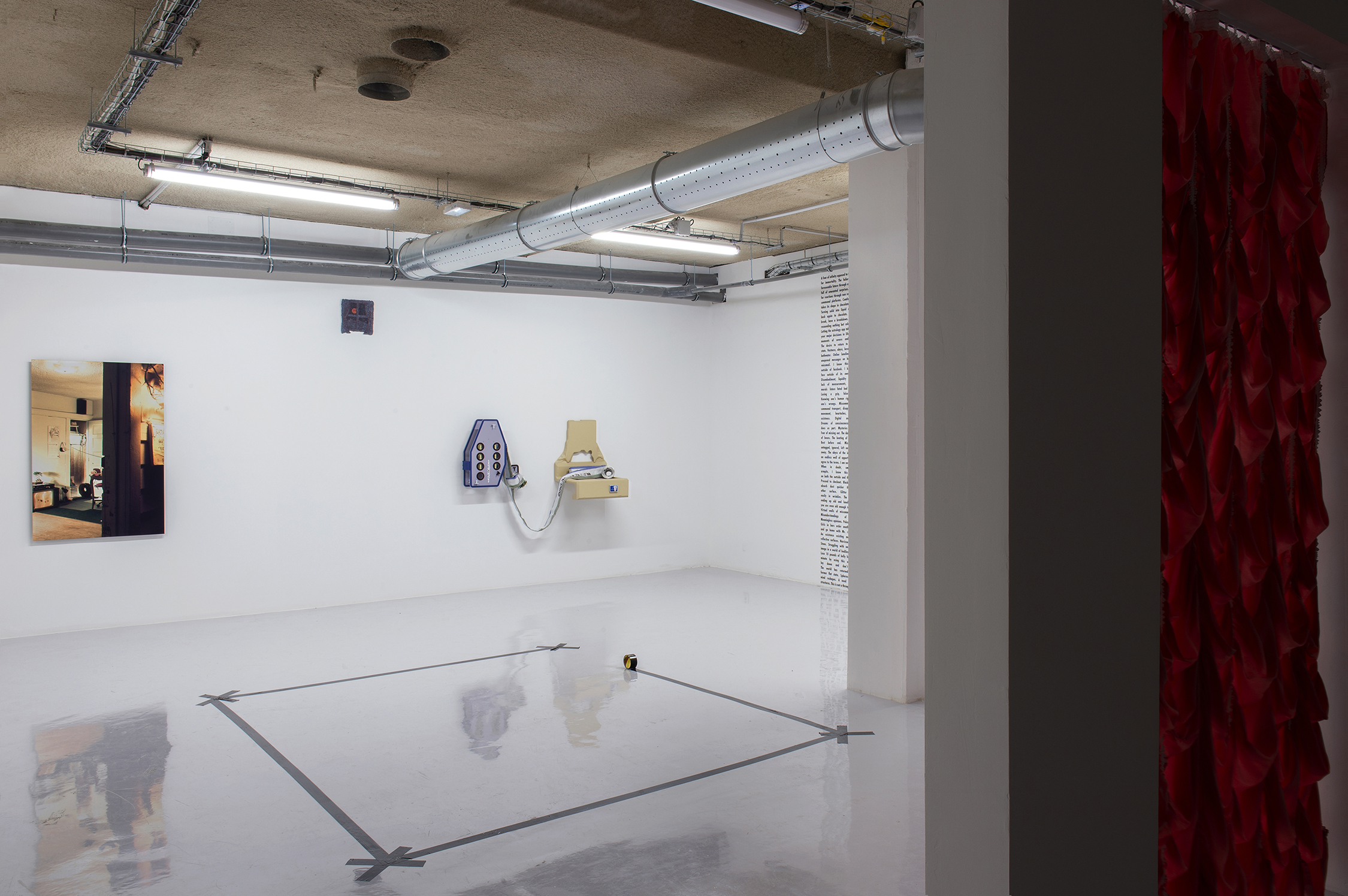 The seven artists in this exhibition offer worldviews that are both familiar and skewed, challenging our perception of the environments we inhabit. Some artworks offer pathways into moments of ecological and personal uncertainty (Xiaoshi Vivian Vivian Qin). Others uncover the constraints imposed by urban socio-economic systems, staging rooms where the body can loosen (Alice dos Reis, Julie Becker). Disembodied feelings and images from virtual spaces morph into architectures to be sensed differently (Hanne Lippard, Sebastian Jefford) while fantastical machines become portals (Magali Reus) and the floor a contact zone for dialogues on otherness (Ndayé Kouagou). As a clear distinction between physical and mental states blurs, different layers of social reality emerge. These artists not only outline the limits imposed by social and economic structures from intimate perspectives; they also engage in a world-making process, offering viewpoints on the complex negotiation of the self within ever-changing landscapes.