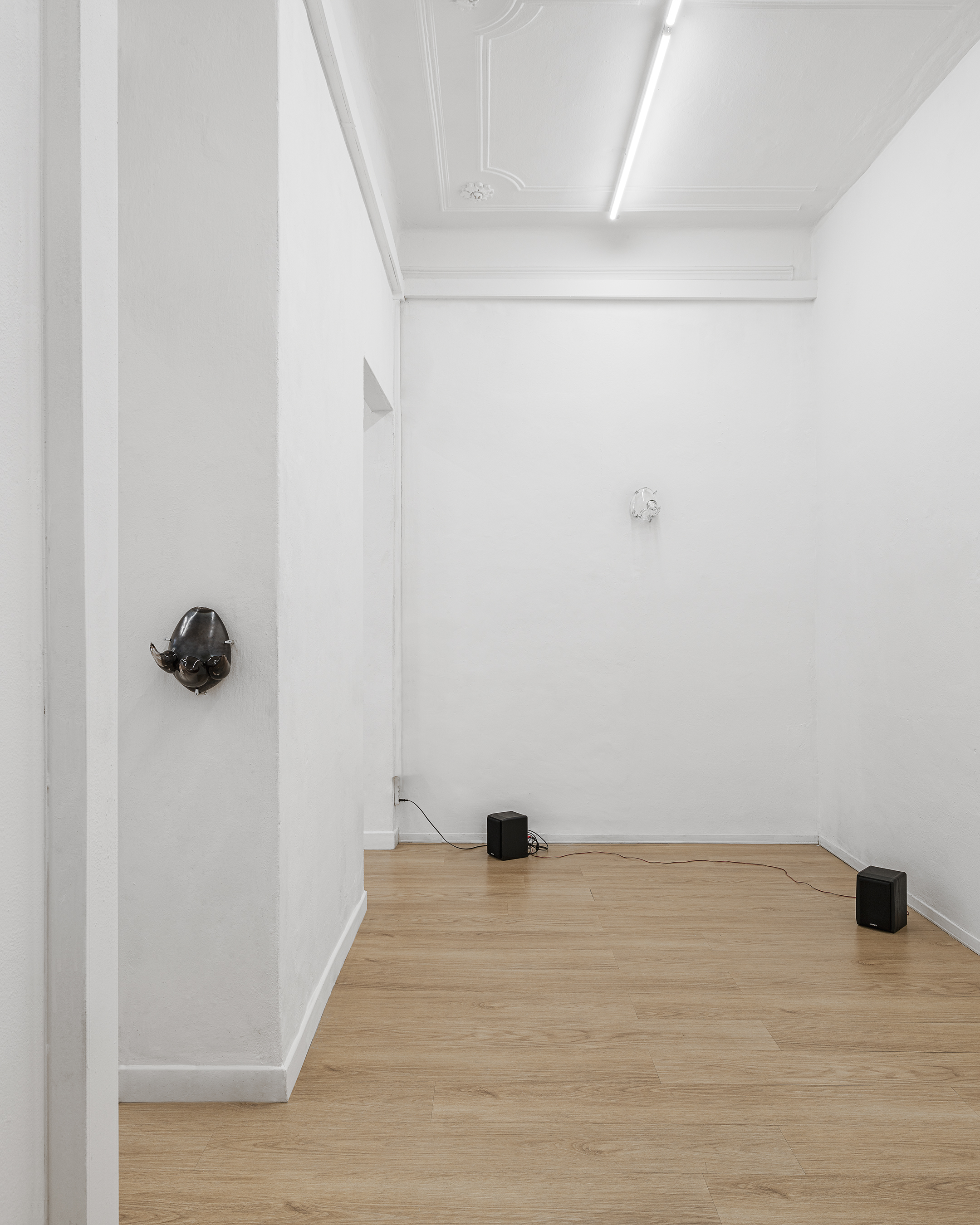 In his newly-commissioned body of work, a multi-sensory installation encompassing text, sound, and sculpture, Tarek Lakhrissi investigates means of entry, re-imagining constraining spaces by conjuring the metaphysical space of ‘hell’. Drawing from his background in literature, Lakhrissi delves into a revised version of Dante’s Inferno, considering Monique Wittig’s lesbian re-writing of the same. In Wittig’s experimental narration, ‘l’enfer’ is a place with rigid conditions, both social and climatic. But unlike Dante’s story, hell is often more common-looking than it seems: it’s accessed via a bar or a pool club, and it’s a place or a situation where Wittig is faced with difficult decisions that put into question her choices in a normative world. Lakhrissi’s work embraces the queer tools embedded in Wittig’s quest, making space for transformative narratives. If ‘hell’ is a place where undesirables are relegated, then Lakhrissi makes it hospitable for all those who are ‘other’. Together with composer Victor Da Silva, he combines sonic traces partly inspired by the Cloud Rap music of TRIPLEGO into an atmospheric sound piece that suspends time and creates a space in between a club and an eerie otherwordly dimension. For Lakhrissi, grates – a recurring visual element found in the streets of Milan – become portals and access points. A poem is embedded in one of the metal sculptures, inviting the reader to find a garden, a space to be with one’s feelings and personal struggles. Inside another grate are little devil creatures – hybrid beings that are both dangerous and faithful guides. Small fires, with their transparency and aqua-coloured iridescence, seem more playful than harmful. The materiality of glass, metal, words and sounds opens an emotional space to re-engage with physicality. By carefully crafting objects and traditions, Lakhrissi creates a place for otherness, a suspension of ‘good’ and ‘evil’: an intimate threshold for sharing and community.